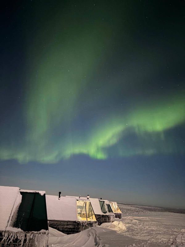Und kaum aus dem Restaurant getreten, schwebte über den Hütten die nächste grüne Wolke. Schnell weitere Gäste hinzugeholt und das Spektakel gemeinsam zu genießen. Mit der Zeit wurde aus der Wolke ein breites Band, das quer über den Himmel zog. Erst lag es ruhig, fast unbeweglich, dann begann es, sich zu verändern: Stellen wurden heller, andere dunkler, der Bogen wanderte, wölbte sich, zog sich wieder zusammen. Je länger wir schauten, desto mehr fiel die Bewegung auf. Das Polarlicht schien nie wirklich still zu stehen – es pulsierte, flackerte leicht, dehnte sich in eine Richtung, zog sich in einer anderen wieder zurück. Es war schwer, den Blick festzuhalten, weil sich immer irgendwo etwas veränderte. Kaum hatte man eine Struktur „verstanden“, löste sie sich schon wieder auf und wurde durch eine neue ersetzt.
