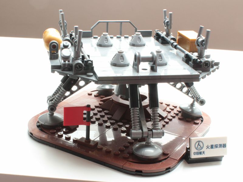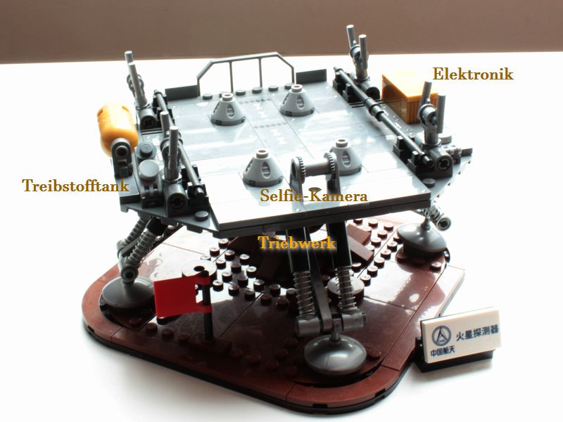 Das Set zeigt als Basis die Marslandschaft. Auf ihr steht stabil der Lander mit seinen vier Beinen und da drauf gut fixiert – wie bei der realen Landung – Zhurong.