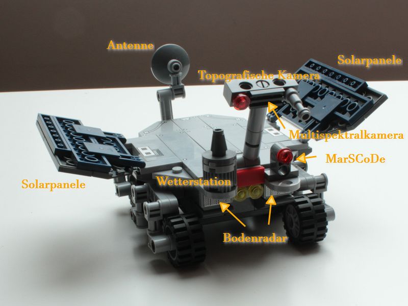 - Vorne am Rover ist zwei Kästen zu sehen, der das Bodenradar (RoPeR) darstellen. Die dazugehörigen Stabantennen wurden jedoch weggelassen.