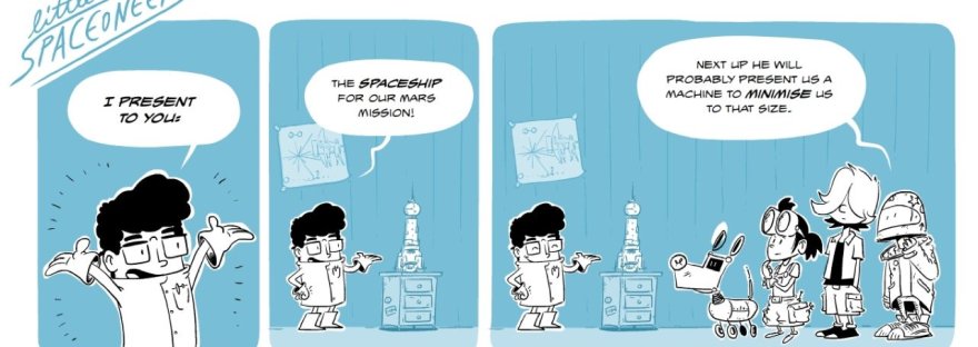 "Ich präsentiere Euch:" "Das Raumschiff für unsere Marsmission!" "Als nächstes wird er uns sicher eine Maschine präsentieren, die uns auf diese Größe schrumpft." Ein Spaceoneers Comic der Design & Data GmbH