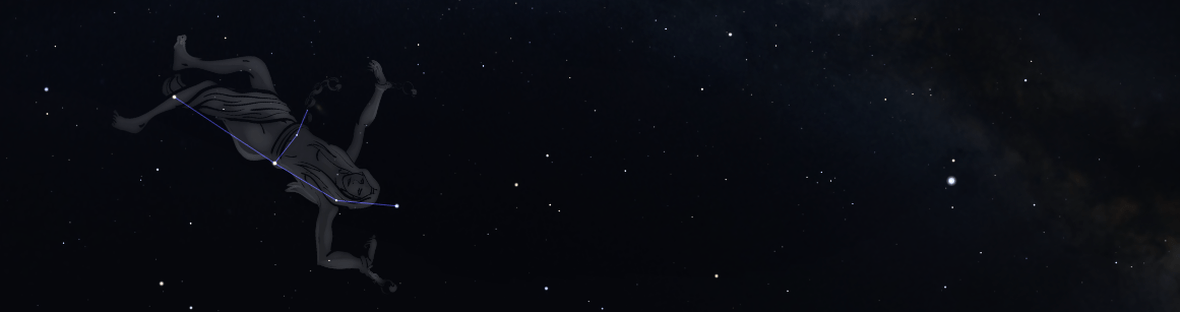 Das Sternbild Andromeda besteht aus einer horizontalen Sternlinie und einer vertikalen, die aus der Mitte der horizontalen abgeht und den Gürtel der Andromeda darstellt. Sie ist schon Ende des Sommers zu sehen und bildet den Anfang der Wintersternbilder. Über ihr befinden sich die Sternbilder Kepheus und Cassiopaia, links Perseus und über den Stern rechts von ihrem Kopf ist sie direkt mit dem Pferd Pegasus verbunden.